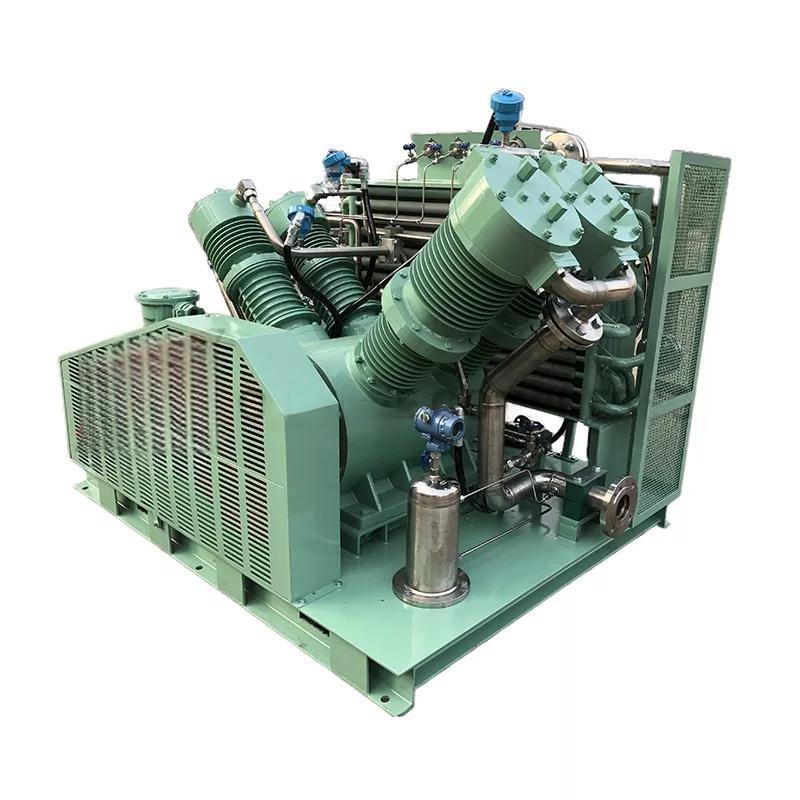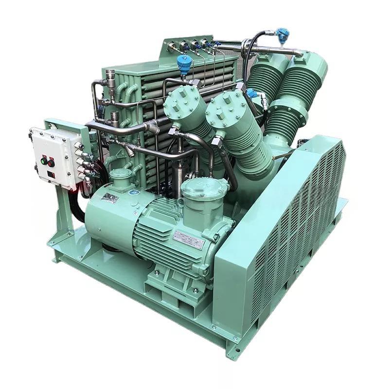 The model is a skid-mounted, two-stage oil-free compressor specifically designed for dry, particle-free nitrogen gas. Engineered with a double V-type structure and advanced non-lubricated components, it delivers contaminant-free compressed nitrogen for various industrial applications. The complete package includes a control cabinet and cooler, ensuring quick installation and reliable operation in sectors such as chemical processing, food packaging, and manufacturing.