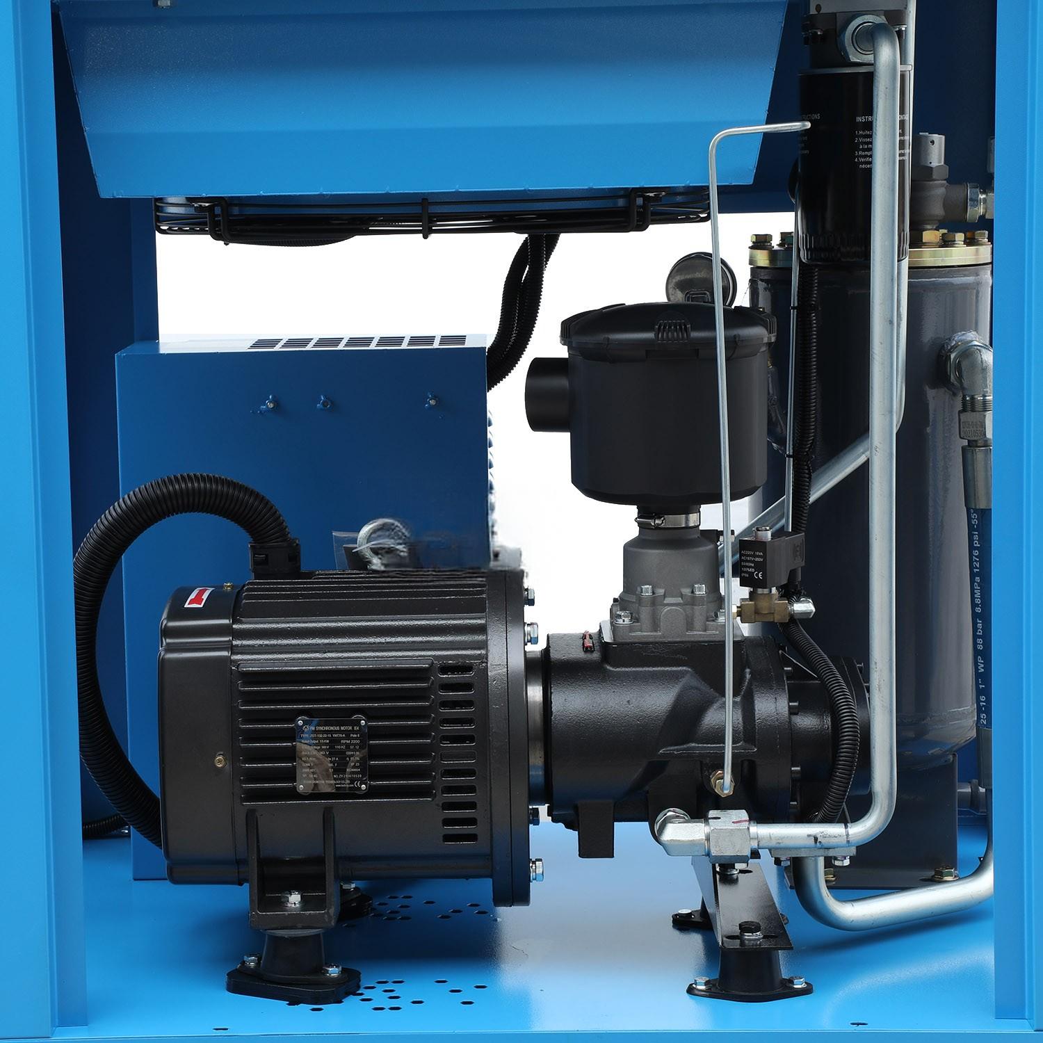 Equipped with a large-sized oil-gas separator and oil return device, effectively reducing compressed air flow velocity and minimizing oil content in the outlet compressed air.